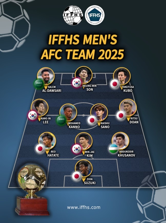 1月27日讯 IFFHS(国际足球历史和统计联合会)公布亚足联2025年年度最佳男足阵容,日本5人韩国3人,胡桑诺夫在列。