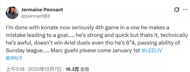 利物浦中卫科纳特本场比赛送点,前利物浦边锋彭南特社媒发文,批评科纳特的表现。